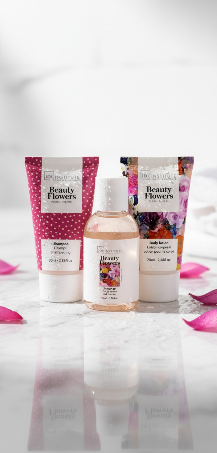 Discover the enchanting IDC Institute BEAUTY FLOWERS TRAVEL BAG CASE, a complete set of 4 beautiful products, perfect for travel or as a gift. This set exceeds expectations with its elegant floral print and the delightful scents of rose, gardenia, and freesia that will pamper your senses. Pamper yourself or surprise a loved one with this luxurious gift.