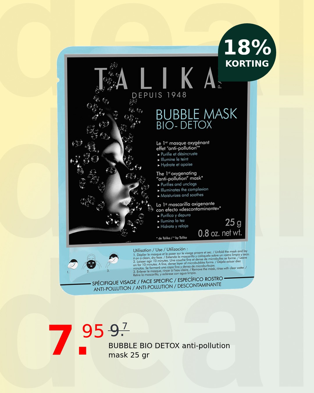Reveal a revitalized complexion with the Talika BUBBLE BIO DETOX anti-pollution mask. This innovative treatment actively combats the daily aggressors your skin faces, leaving it visibly clearer and more radiant. Experience a refreshing cleanse that purifies and rebalances for a healthy, glowing appearance.