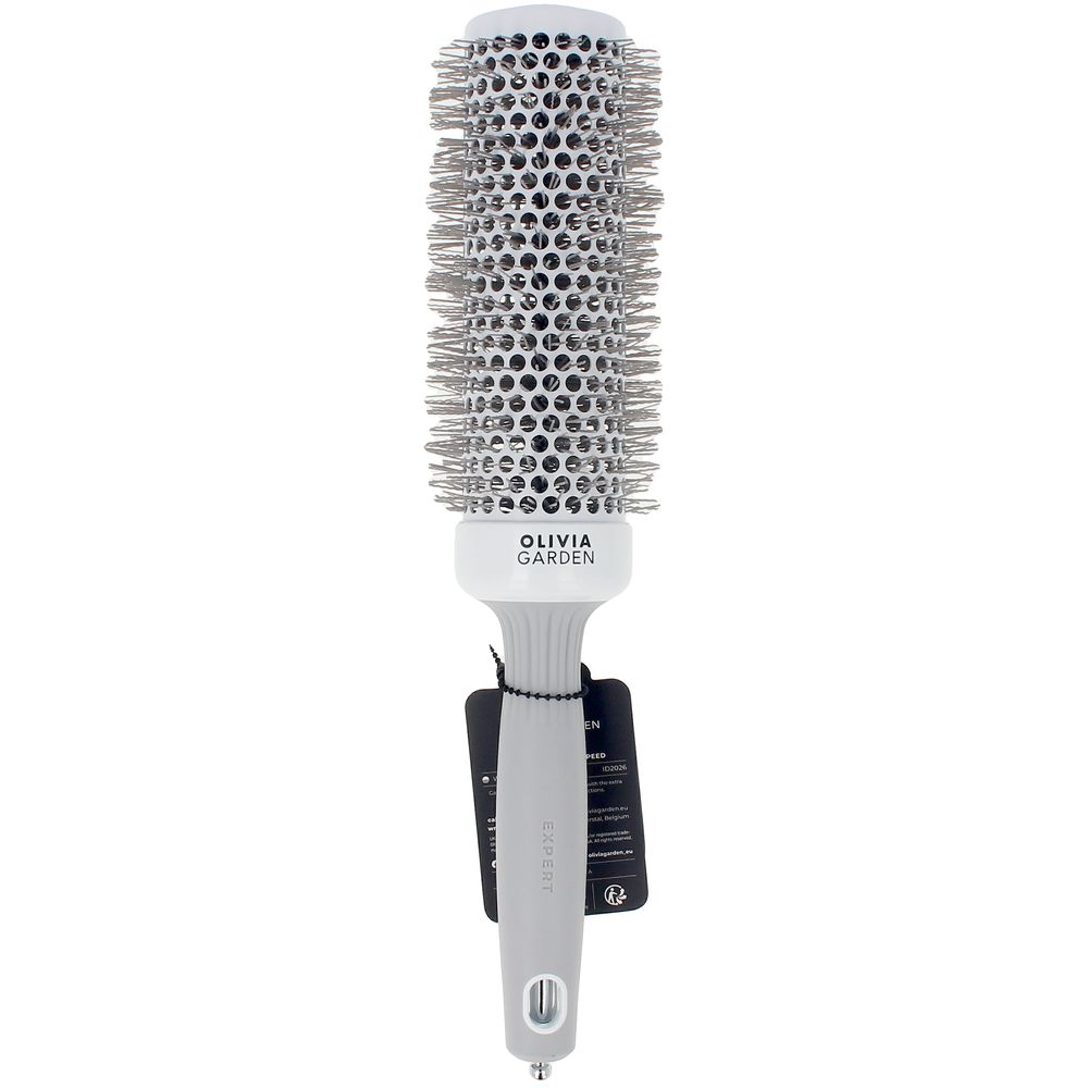 Introducing the XL thermal brush from OLIVIA GARDEN, the CERAMIC+ION styling tool. This innovative brush features advanced ceramic technology in its barrel, allowing it to heat up more quickly while retaining warmth for improved and enduring styling results. Designed with large air vents, it enhances airflow to minimize drying time. The tourmaline ion technology works to nourish the hair cuticle, adding shine, reducing frizz, and eliminating static. The bristles are uniquely crafted to withstand high temperatures while being gentle on both hair and scalp. Additionally, the handle boasts an exclusive design with a hook for convenient storage, ensuring a comfortable and lightweight grip for effortless styling.